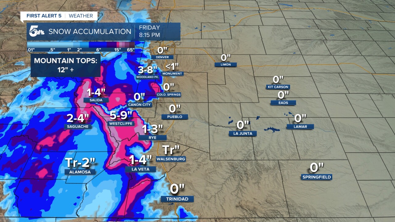 Rain and snow showers continue tonight. Snow will be in the mountains, dropping to as low as 7,000 feet in elevation. The I-25 corridor and lower elevations will see rain showers.