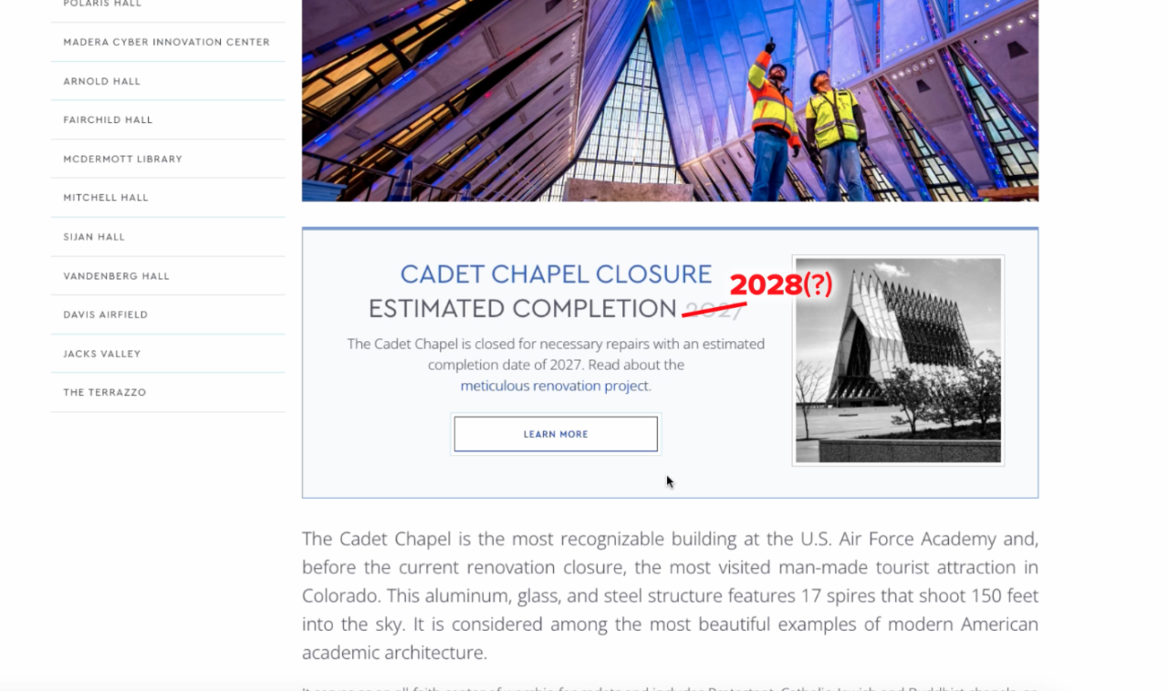 COLORADO SPRINGS, Colo. (KOAA) — The Air Force Academy Cadet Chapel restoration project is getting more expensive with yet another delay, now targeting November 2028 as the completion date.
