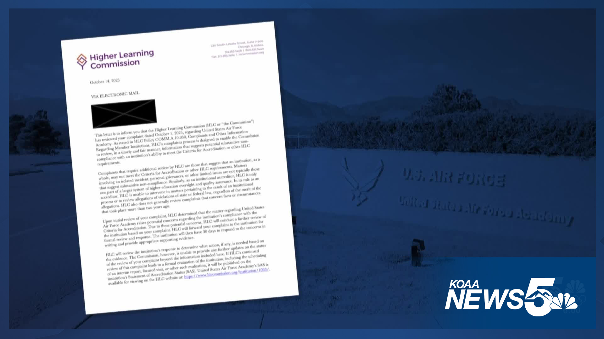 HLC said it forwarded the complaint to USAFA for a formal review and response. The Academy must respond to the concerns in writing and provide appropriate supporting evidence.