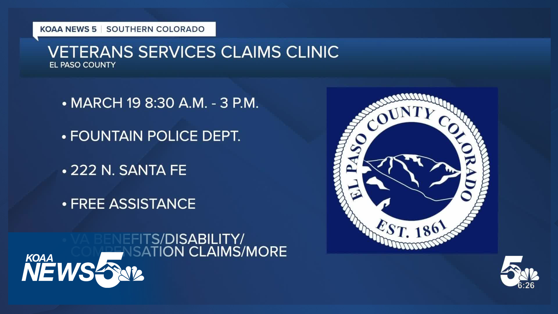 EL PASO COUNTY, Colo. (KOAA) — The El Paso County Division of Veterans Services will be hosting a Veterans Claims Clinic on Thursday, March 19, from 8:30 a.m. to 3:00 p.m. at the Fountain Police Department (222 N. Santa Fe Avenue).