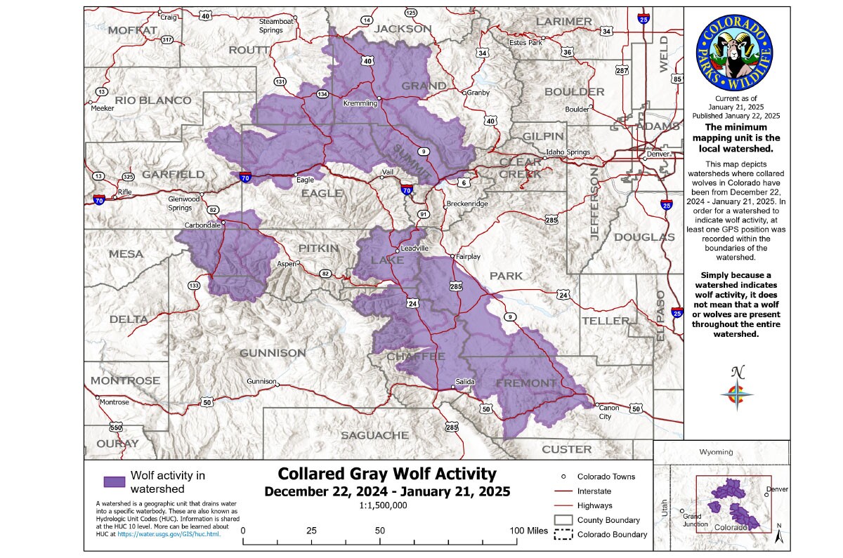 "Recent wolf collar data shows that one wolf has made movements into southeast region watersheds that include Park County, Teller County and Fremont County," said Travis Duncan with CPW. "This was to be expected and it's important to remember wolves can and do move substantial distances."