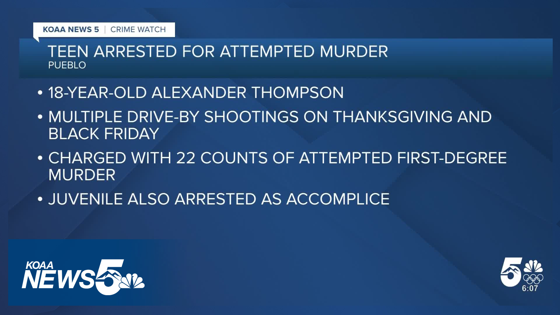 Alexander Thompson, 18, faces 22 counts of attempted first-degree murder related to four separate drive-by shootings that took place on Thanksgiving and Friday. A 16-year-old was also arrested as an alleged accomplice in the incidents.