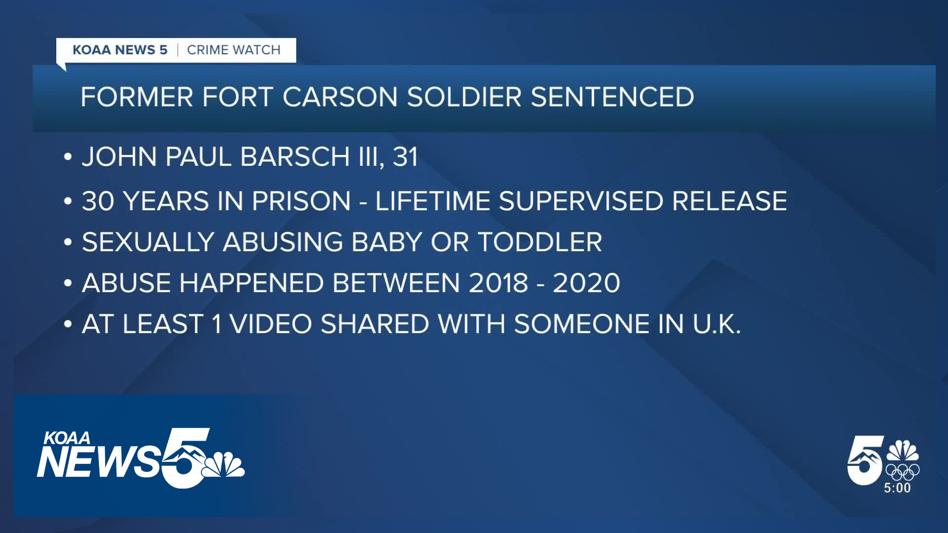 FORT CARSON, Colo. (KOAA) — The United States District Attorney's Office for the District of Colorado announced Tuesday that a former Fort Carson soldier has been sentenced to 30 years in prison for producing child pornography.