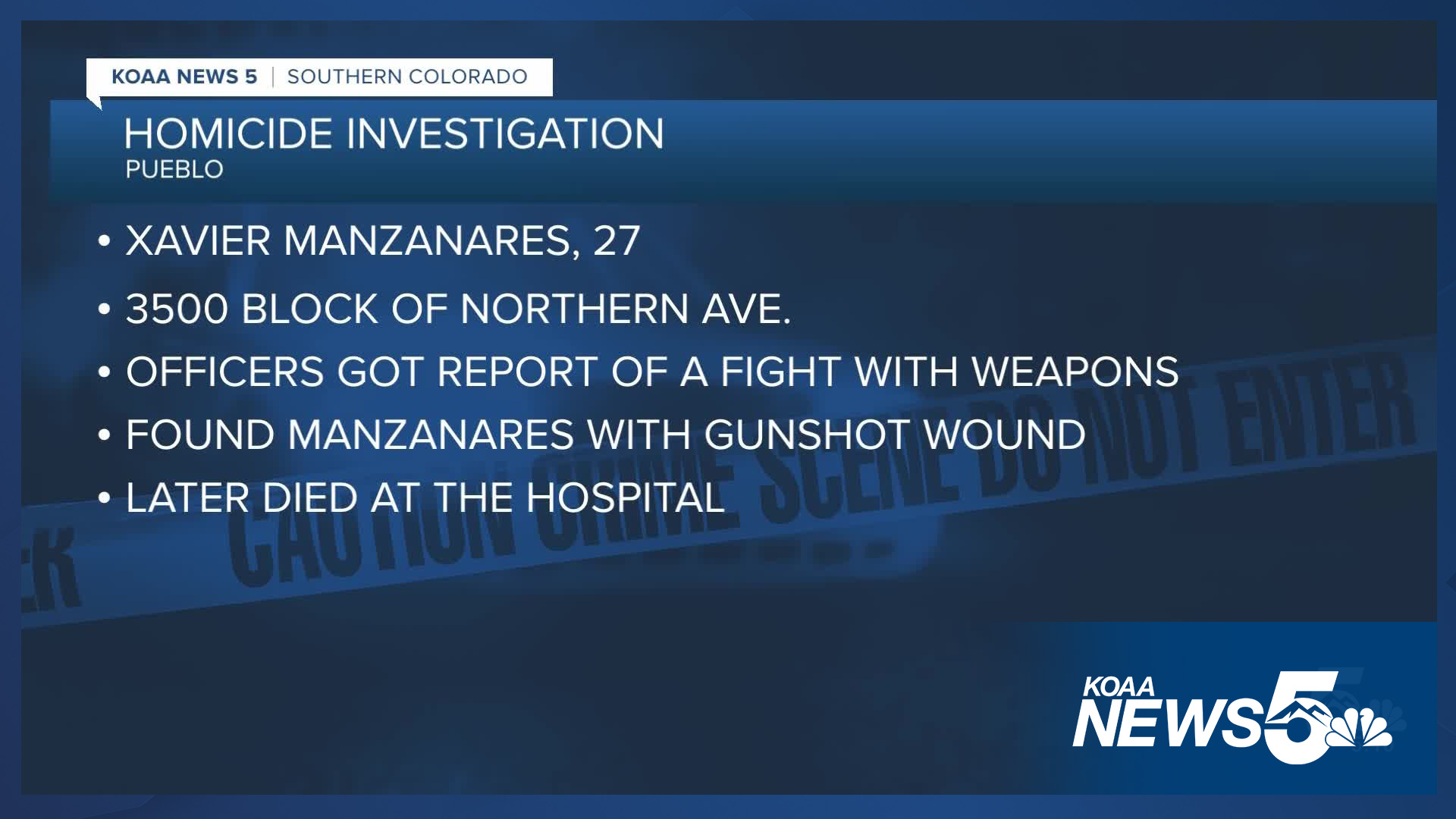 His family has been notified, but the cause and manner of death are still under investigation. The Pueblo Police Department is investigating this incident as a homicide.