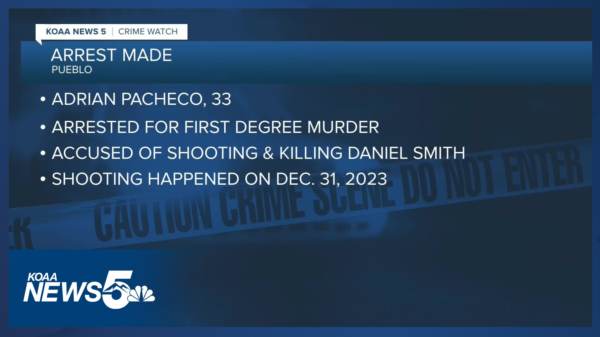 The Pueblo Police Department has arrested Adrian Pacheco , 33, for First Degree Murder in the shooting death of Daniel Smith on Dec 31, 2023. pic.twitter.com/gNeN2vBXd5