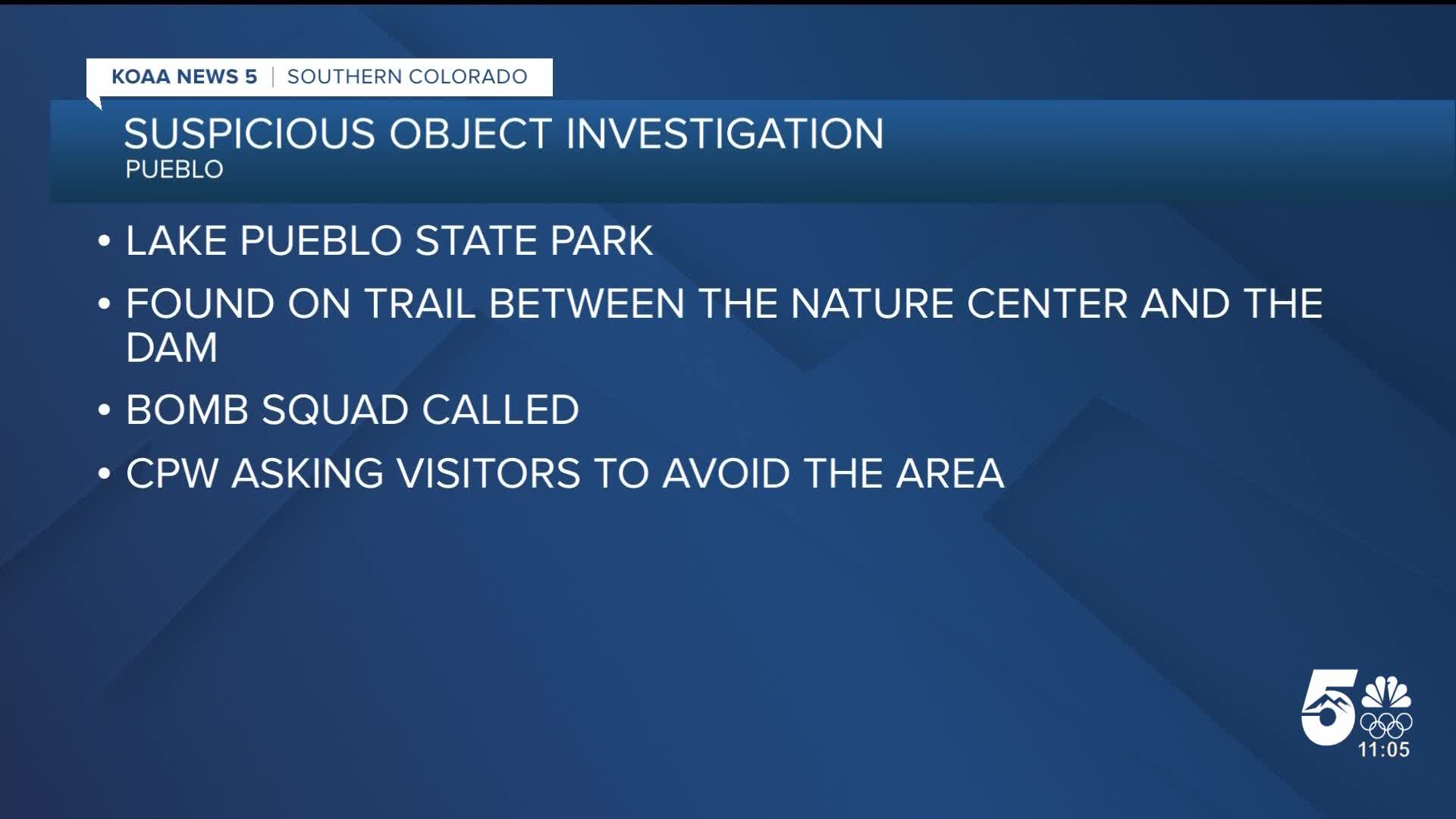 PUEBLO, Colo. (KOAA) — Agencies are investigating a suspicious object Tuesday night at Lake Pueblo State Park, according to Colorado Parks and Wildlife (CPW).