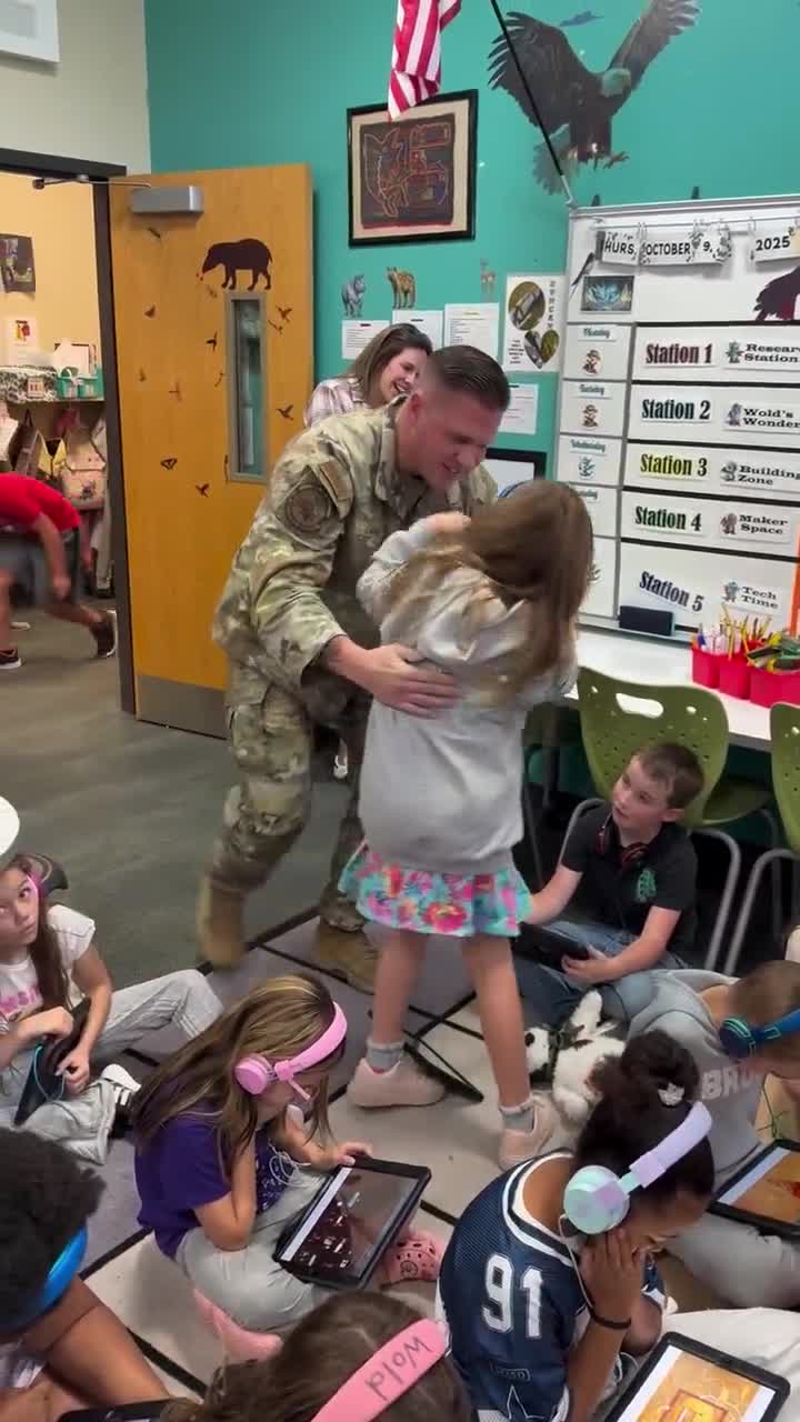School District 49 shared a powerful video of an airman coming home from his overseas deployment, a few days earlier than his daughter expected. D-49 shared the video of third grader Lena Larm as she sat in class at the Academy for Literacy Learning and Innovation Excellence in the east side of the city on Thursday. Msgt. Tren Larm was caught on video coming into the classroom with Lena's back turned.