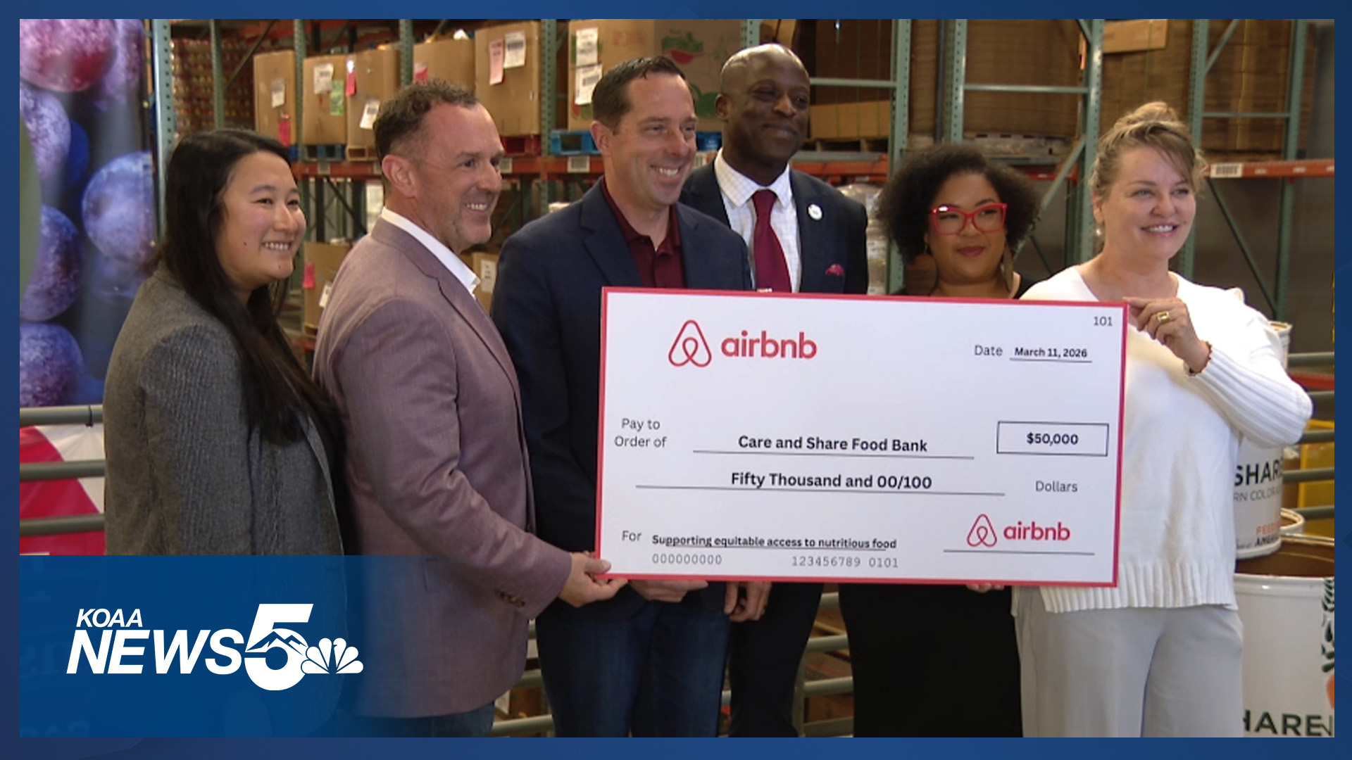 COLORADO SPRINGS, Colo. (KOAA) — Care and Share Food Bank of Southern Colorado received a big financial boost on Wednesday. Airbnb donated a check of $50,000 to our region's largest food bank.