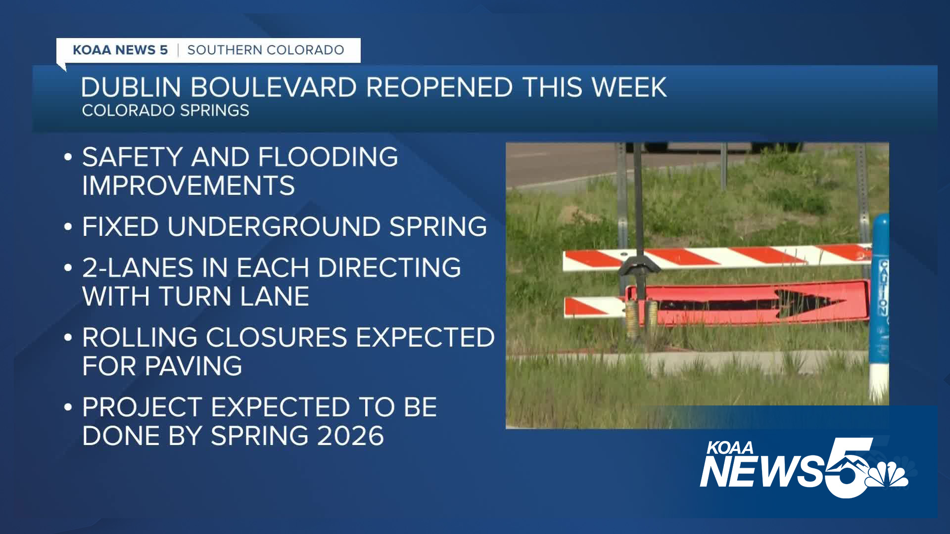 On Friday, the City of Colorado Springs announced that Dublin Boulevard reopened between Fieler Drive and Issaquah Drive.