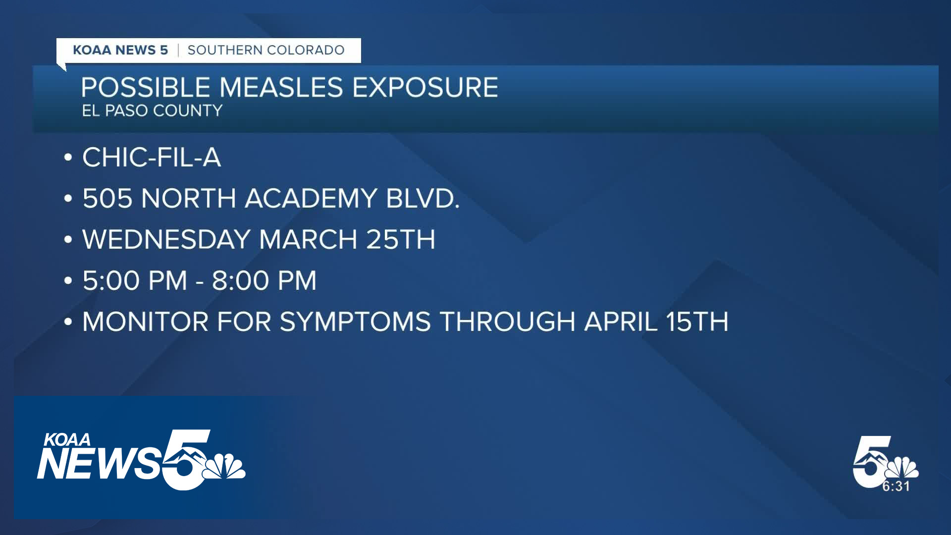If you were at the Chick-Fil-A at the Citadel Crossing Shopping Center on March 25 between 5 p.m. and 8 p.m., CDPHE says you may have been exposed to measles and should monitor symptoms for 21 days after exposure.