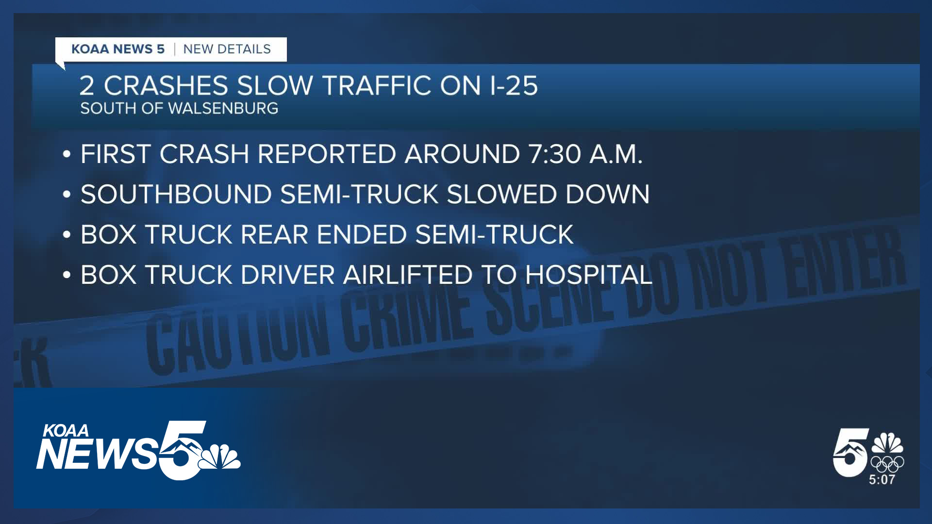 Just before 8 a.m., the Colorado Department of Transportation (CDOT) was reporting there were delays for a crash south of Walsenburg, near I-25 Exit 40.