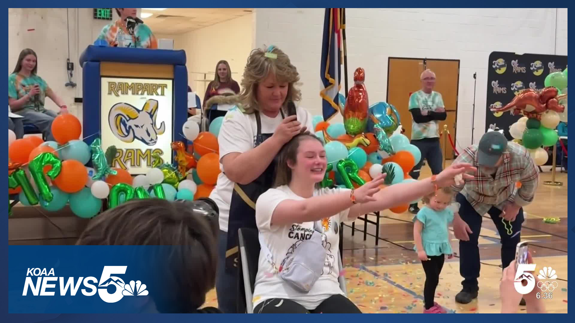 COLORADO SPRINGS, Colo. (KOAA) — Rampart High School's 19th annual Bald 4 Bucks fundraiser drew more than half a dozen other District 20 schools to a massive assembly to raise money for cancer research — but this year, one seat was empty.