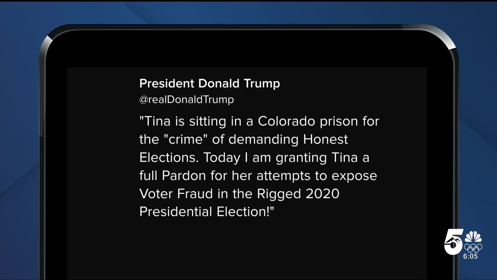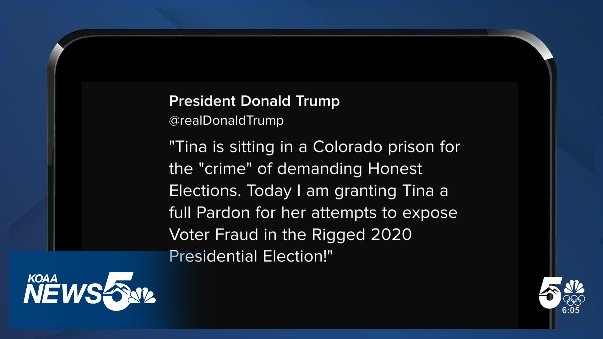 DENVER, Colo. — President Donald Trump on Thursday said he was granting a “full pardon” to disgraced former Mesa County Clerk Tina Peters, who was convicted last year on state charges for tampering with Colorado's election systems in the 2020 presidential election.