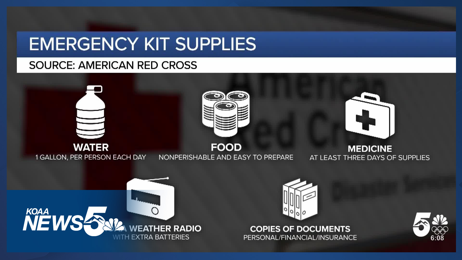 COLORADO (KOAA) — Some southern Coloradans over the years always have an emergency evacuation kit ready. The Red Cross has a list of the basic emergency supplies to keep on hand.