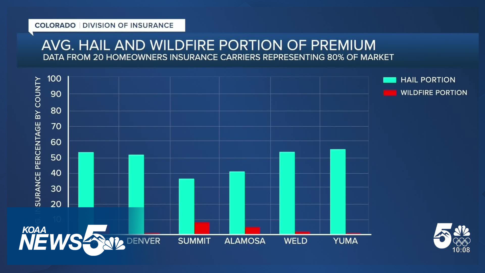 In El Paso County, for example, hail risk accounts for 52.5% of a homeowner's insurance premium while wildfire risk makes up just 6%.