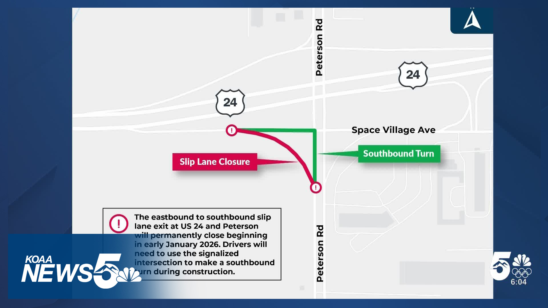 COLORADO SPRINGS, Colo. (KOAA) — Starting Monday, January 5, the City of Colorado Springs will be permanently closing the slip exit lane from eastbound U.S. Highway 24 to southbound Peterson Road.