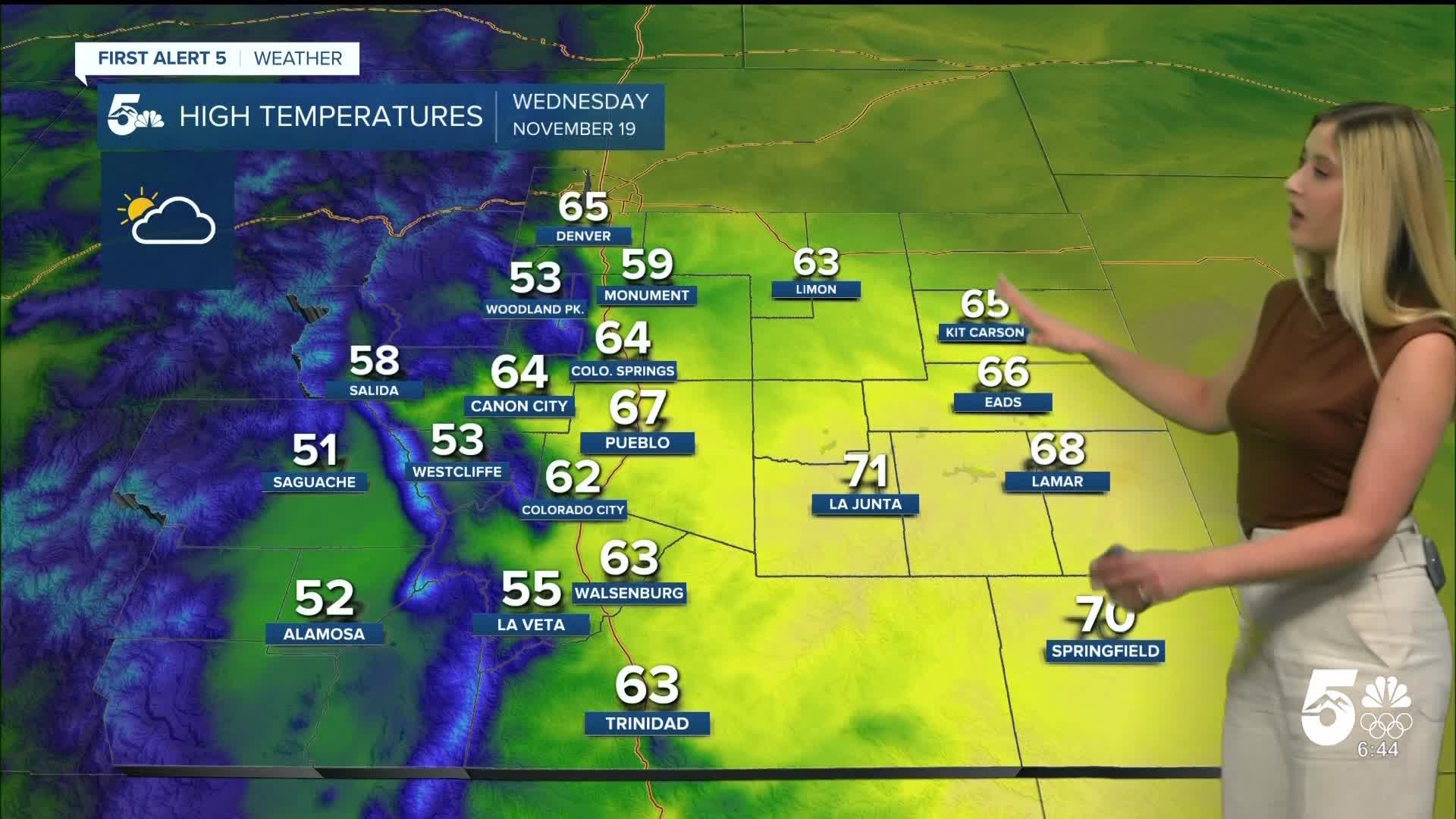 It will be partly cloudy with warm temperatures on the plains in the mid-60s to low 70s on Wednesday. Wind will be out of the S at 5-15 mph gusting to 20 mph.