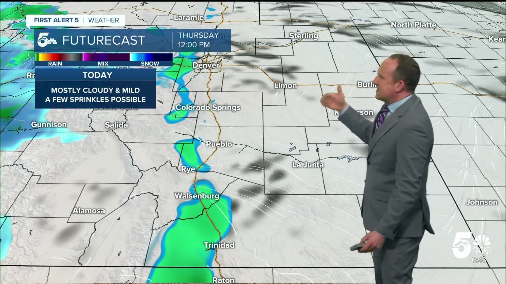 On the Plains today, it will be mostly cloudy and mild. There's some indication that a few showers may make it east of the mountains late this morning or this afternoon. Chances appear pretty low because westerly wind at the surface is not conducive to moisture for the lower elevations. However as the atmosphere moistens up later today, a few showers will be possible along and near I-25.