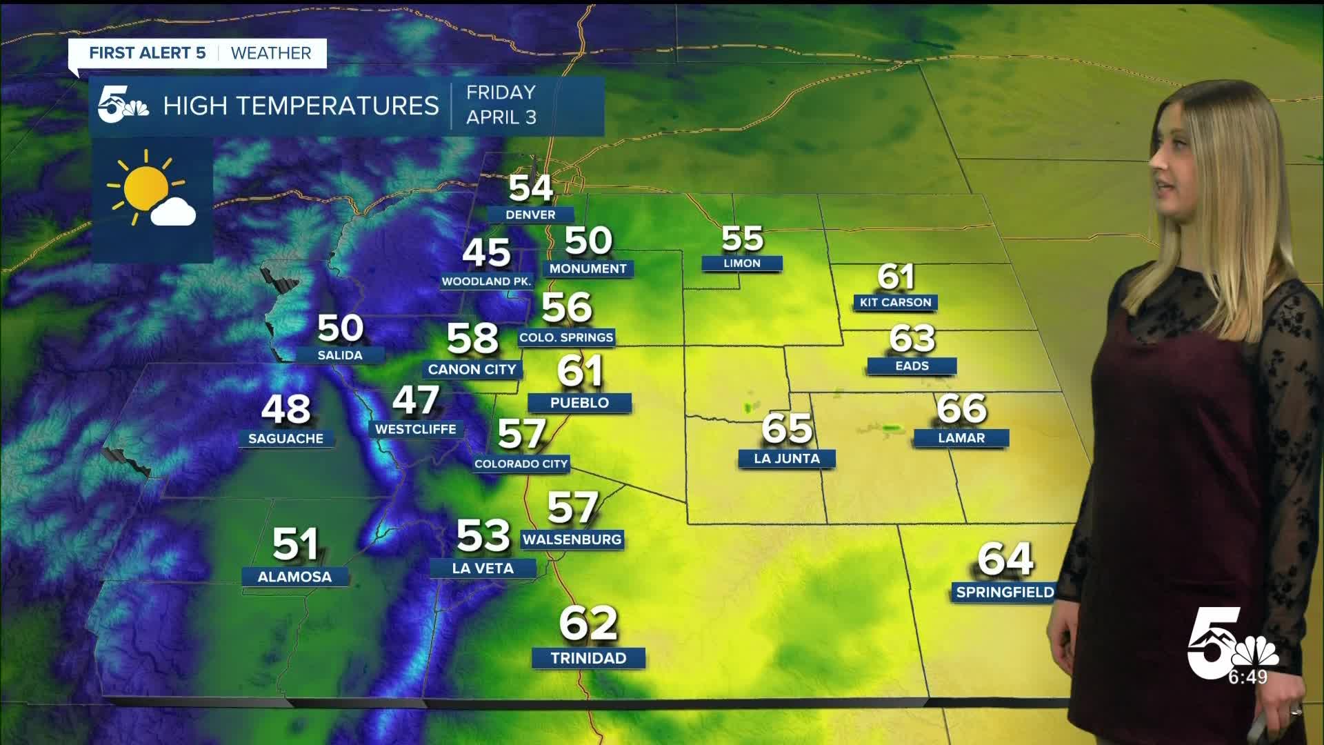 Easter weekend is looking pleasant! Temperatures return to the 60s and 70s in southern Colorado. The wind will be light with a slight breeze each day. It will be chilly Easter morning in the mid-30s in the plains and 20s in the mountains.