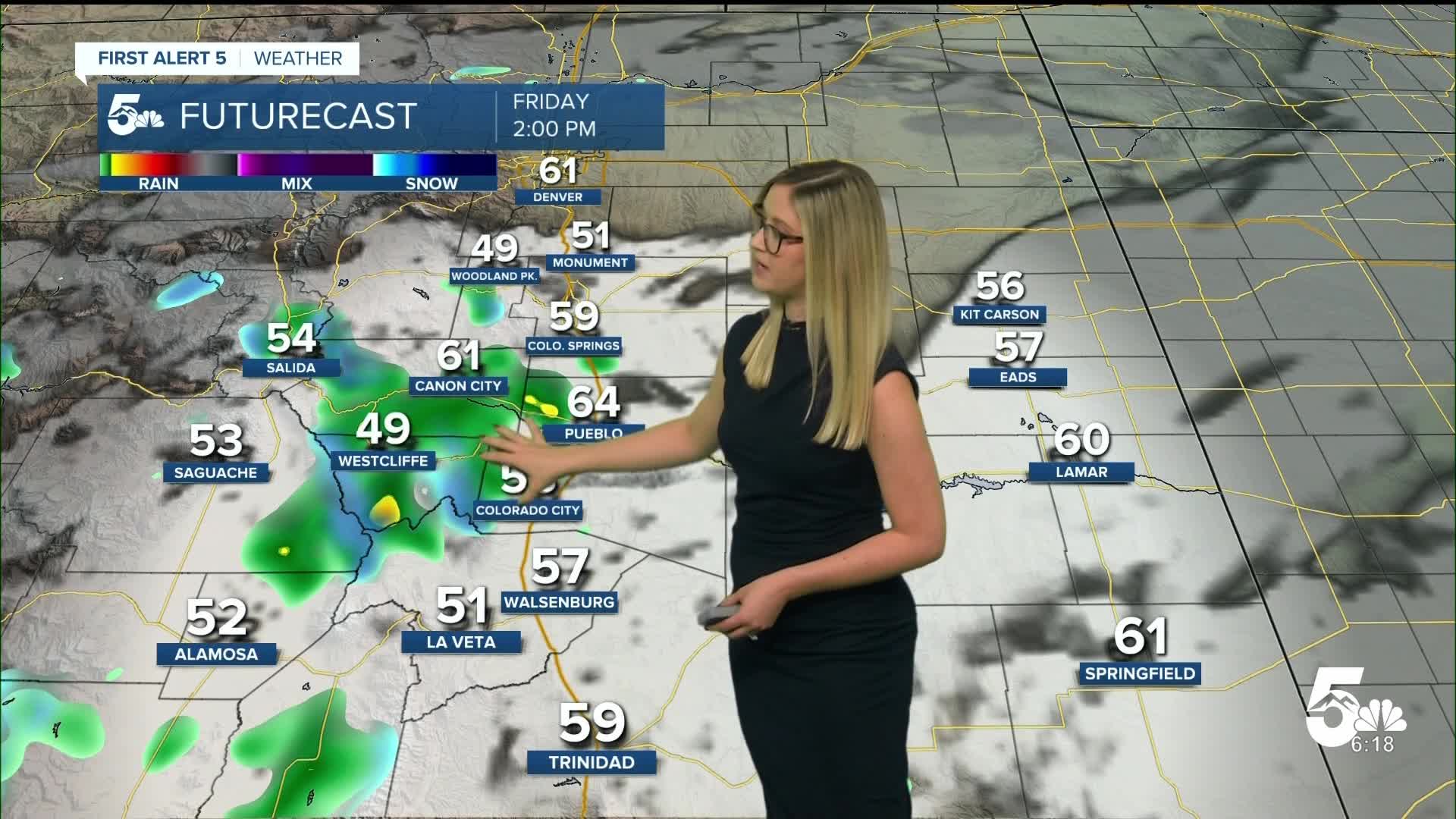 The mountain valleys will see rain or a wintry mix possible on Friday, with snow showers above 10,000 feet. Wind will be out of the NNW at 5-15 mph.