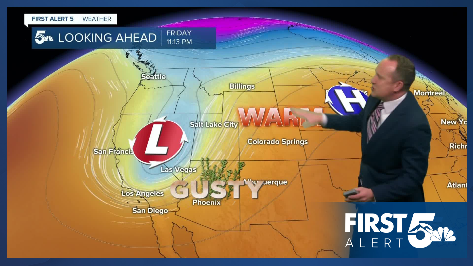 An incoming storm system will bring us breezy to gusty winds on Friday, with stronger wind gusts to 35 mph across Southern Colorado on Saturday. Highs on Saturday will still be above average, topping out in the upper 70s and 80s on the Plains. Our next cold front now looks to arrive early Sunday, with highs dropping down to the 60s and lower 70s by the end of the weekend. Moisture looks more abundant with this system in the mountains and in northern Colorado, with only a slight chance for showers around the Pikes Peak Region.
