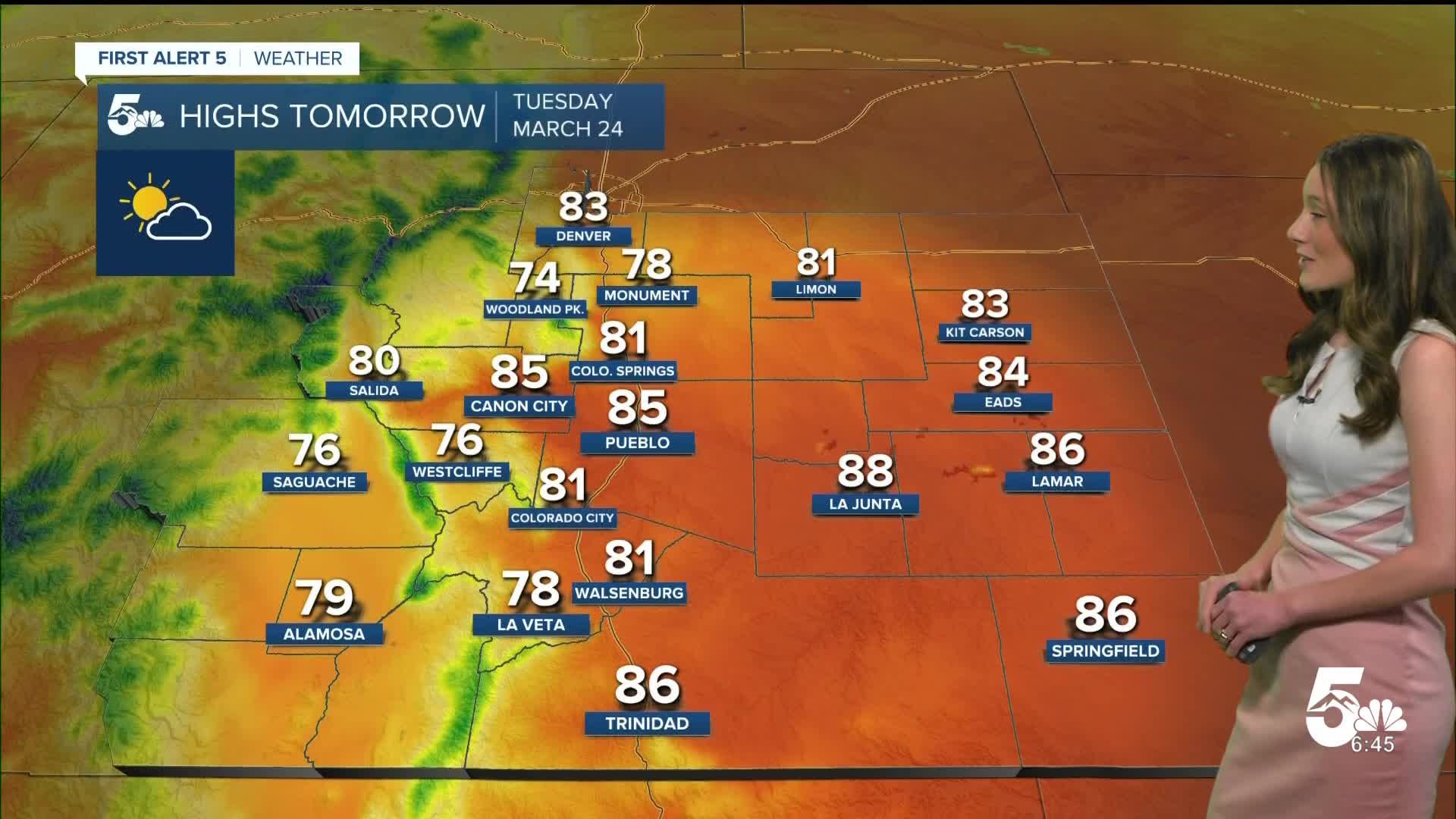 Pueblo will reach the lower 40s overnight. Afternoon temperatures will also likely break records with our forecasted high getting into the mid-80s. The previous record is 82 degrees. There will be a few clouds, but plenty of sunshine.