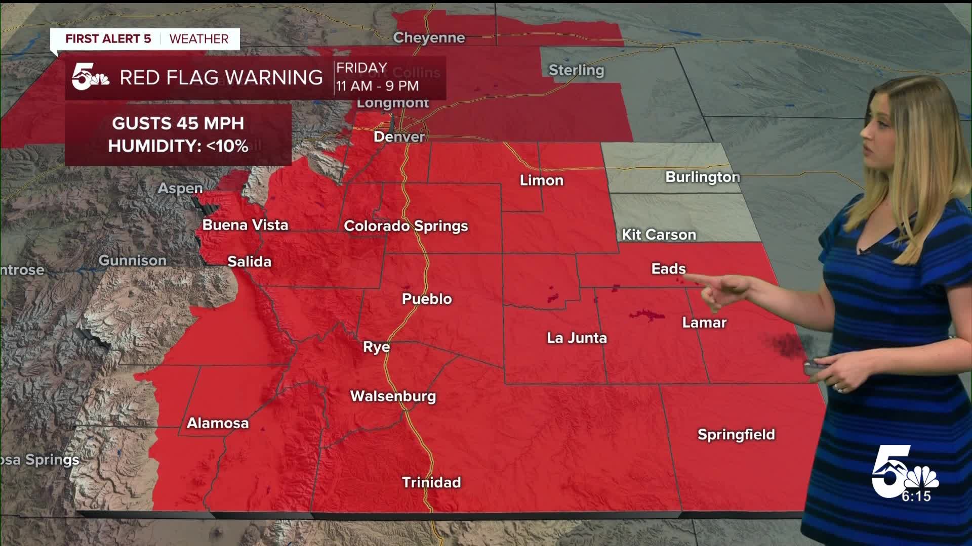RED FLAG WARNING 11 am until 9 pm. Remaining dry and gusty on Friday with W wind at 15 mph gusting to 40 mph.