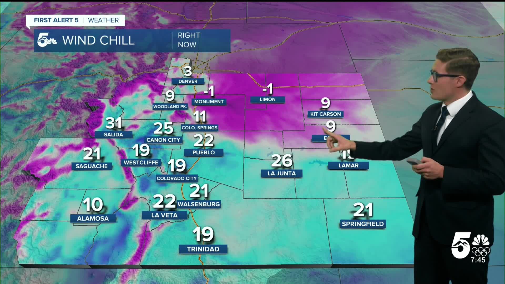 It will be very cold today in southern Colorado, following a cold front early this morning. Highs will be in the low 30s in most areas, with gusty north winds this morning. Winds will reduce along I-25 by mid-morning, but it will take until mid-afternoon for the winds to slow over the eastern counties. Expect wind chills in the teens, and bundle up today. Skies will be mainly sunny.
