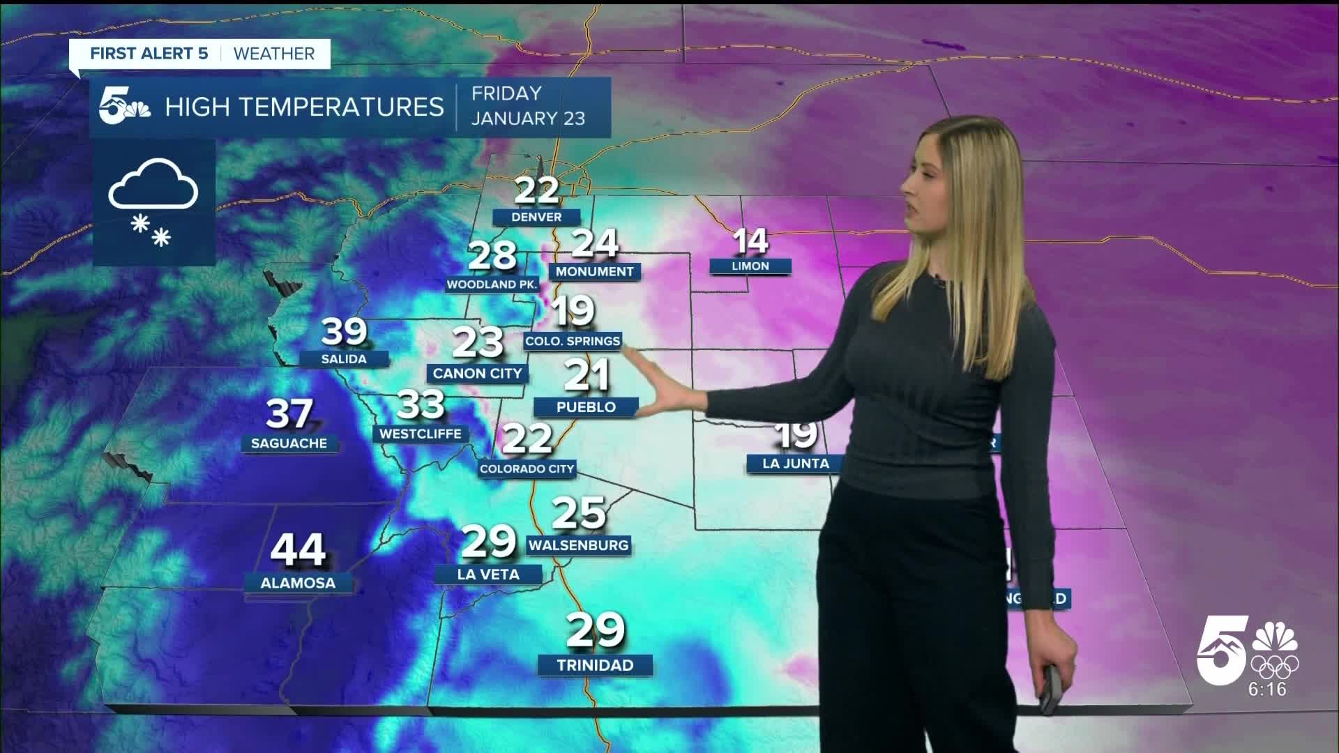 It will be partly to mostly cloudy with a chance of spotty snow showers in the mountain valleys. It won't be quite as cold as the plains, as the cold air will be very shallow on Friday.