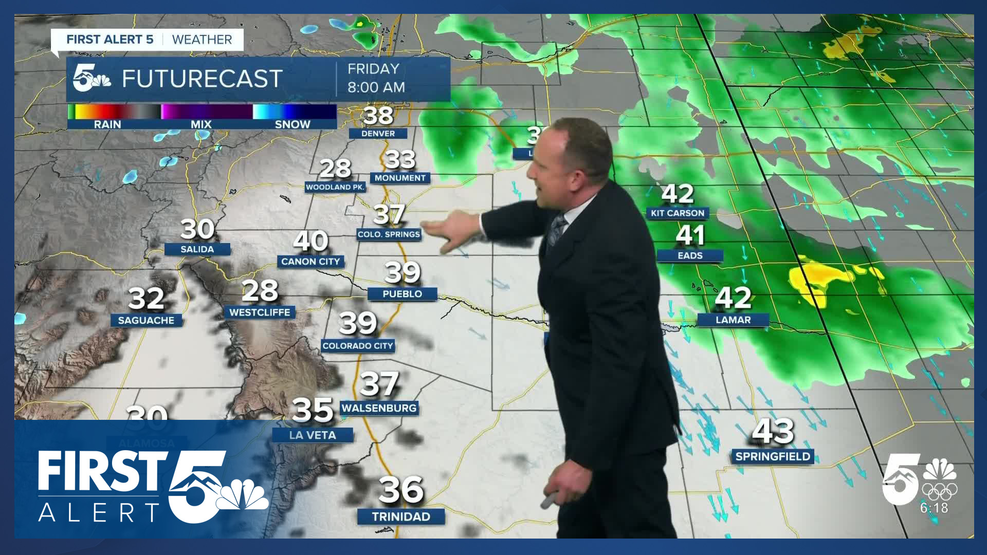 We'll see a break in the weather on Saturday, which should allow highs to rebound into the upper 50s in Colorado Springs and low 60s in Pueblo. By Sunday morning, our next storm will start to spread snow into our state's central and southern mountain ranges, with periods of rain in Colorado Springs and the southern I-25 corridor through the day.
