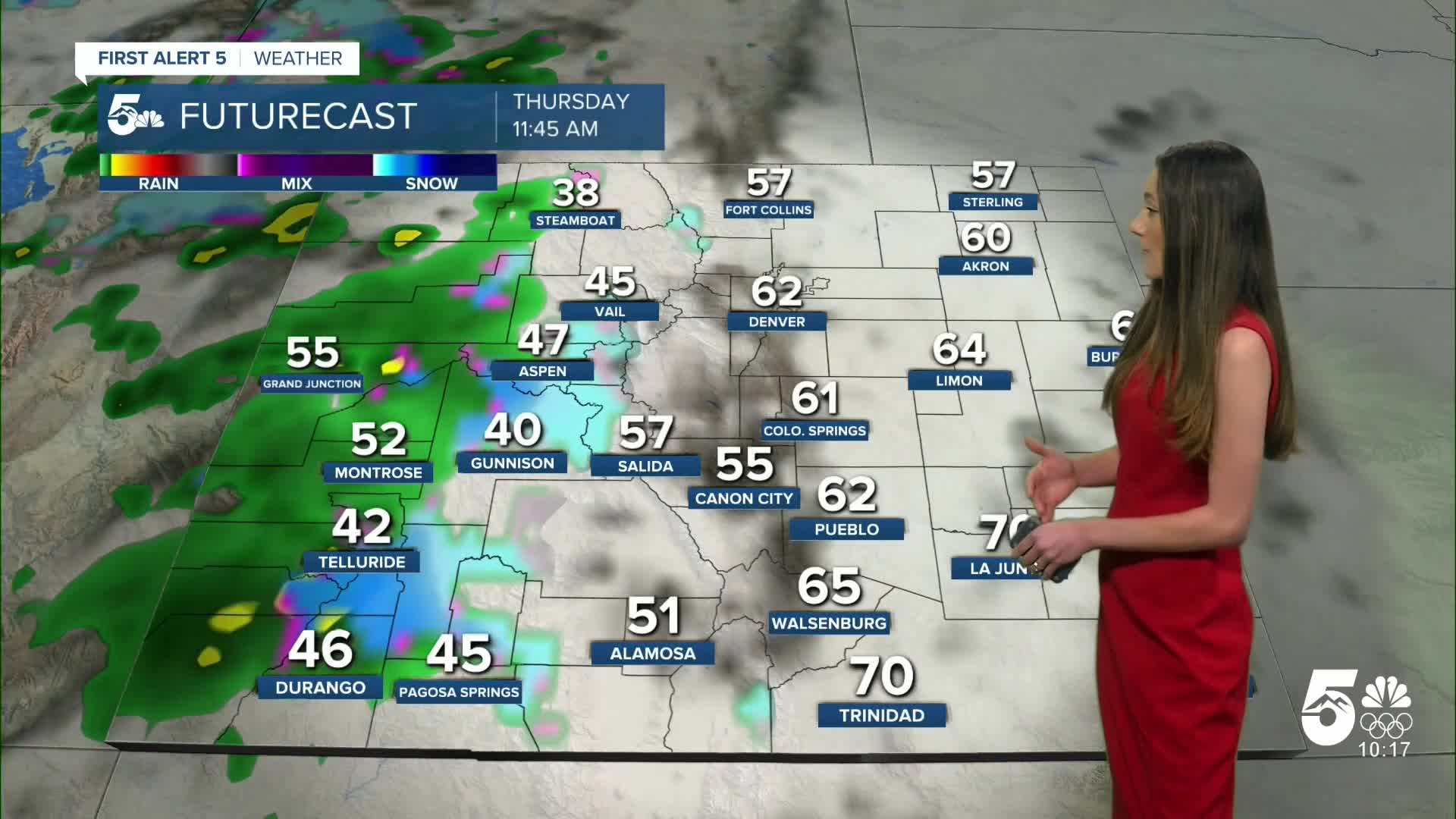 The mountains will have the coldest temperatures in the 30s. Highs later on in the day will be in the 50s. Colder temperatures won't arrive until the weekend. Snow will continue through the day and end closer to Friday morning.