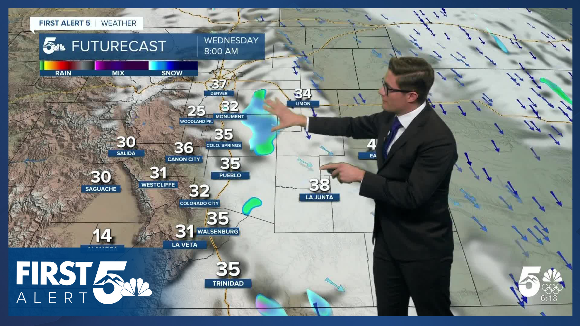 Another cold front will arrive Thursday night. It's coming from the same direction as the front that moved through last night, but this system is slightly further west and brings colder air closer to Colorado. Therefore, we see a bigger cooldown with this system and stronger wind gusts - which will again favor the Palmer Divide, and plains. High wind watches are in place Friday for the northeastern plains of Colorado. Highs will feel winter like: upper 30s, to low 40s, with cooler wind chills. The cool air sticks around Saturday as a reinforcing push of cold air backs into the area, and we have upslope flow for a portion of the day. Sunday will be sunny and mild.
