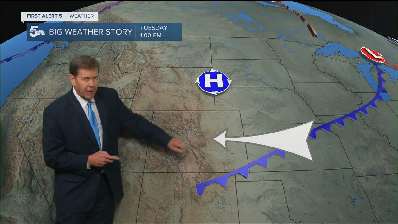 TRI-LAKES: Low: 40s/50s; High: 70s. A Tuesday morning cold front will bring a much cooler and wetter day to northern El Paso County, along with the chance for an isolated strong to severe thunderstorm.