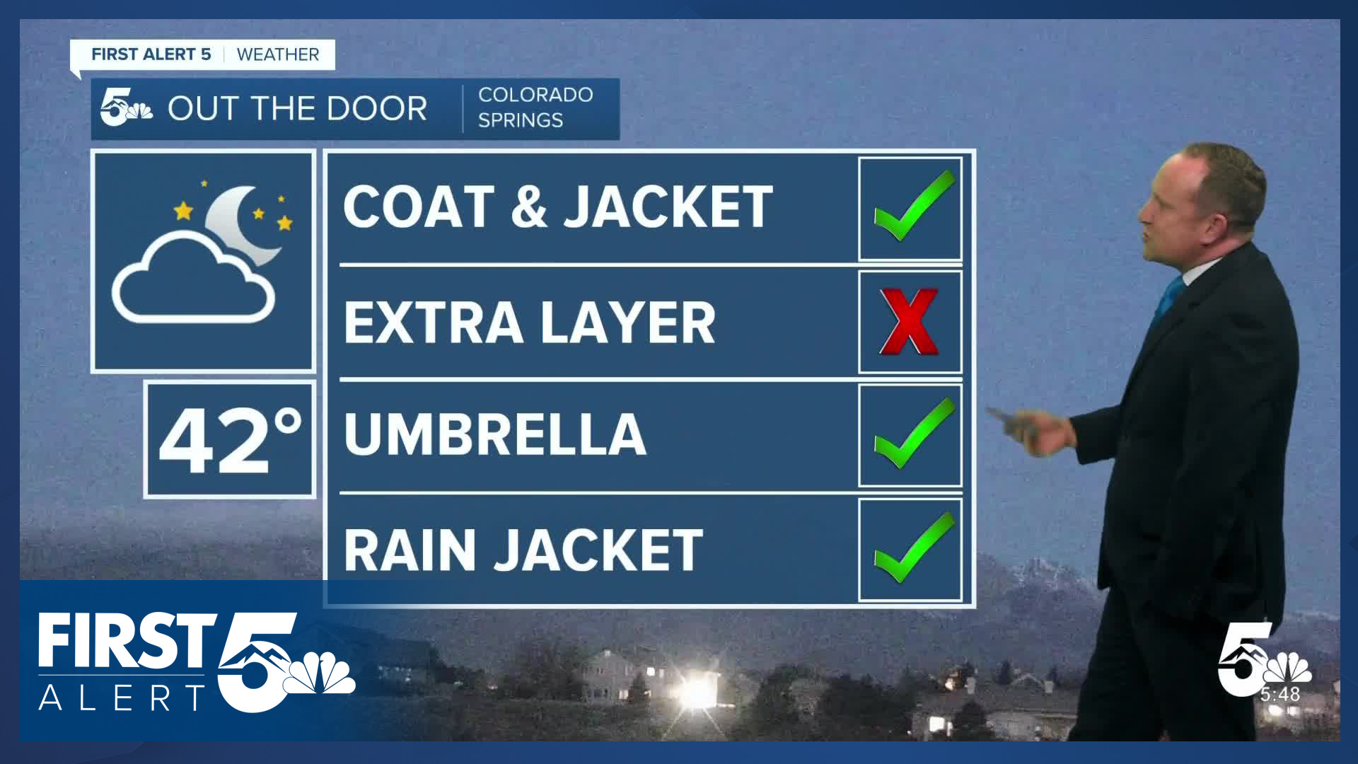 Colorado Springs forecast: High: 62; Low: 42. Overcast skies and cooler highs can be expected as we wrap up the week in the 60s. Increasing moisture will bring us another round of scattered showers and thunderstorms towards the late afternoon and evening hours.