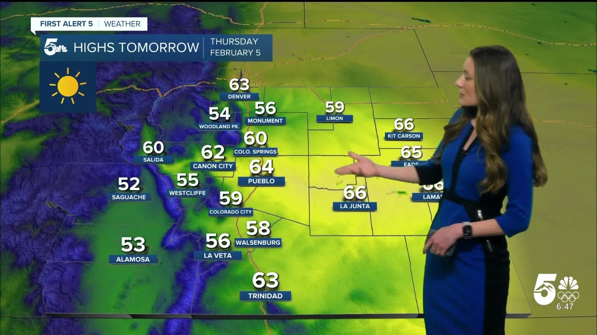 Pueblo will have temperatures dip into the 20s overnight. We will only be feeling this chill in the air during the morning hours before temperatures climb into the mid-60s. Skies will be clear and winds will be on the calmer side between 5 and 10mph.