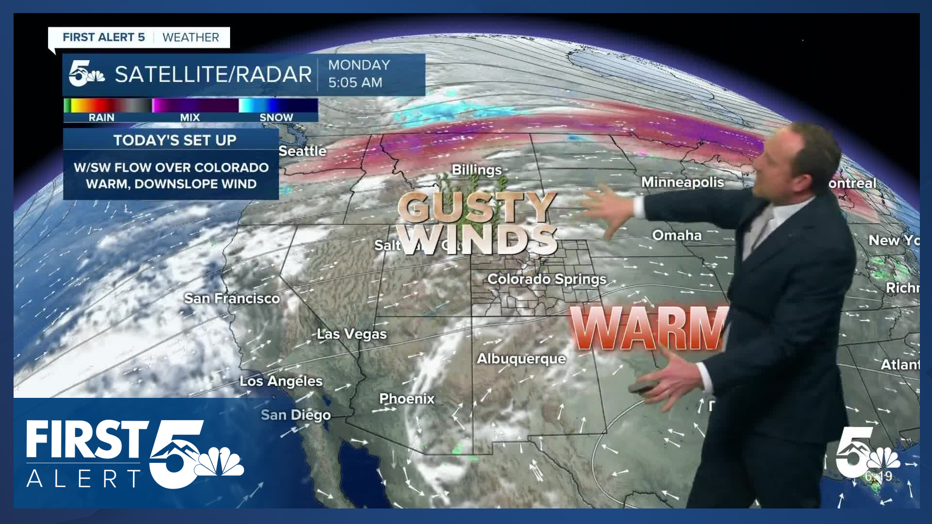 The downslope wind will drive temperatures up, with highs today soaring into the 70s and 80s. Several heat records will be in jeopardy this afternoon, from Colorado Springs to Pueblo to Alamosa.