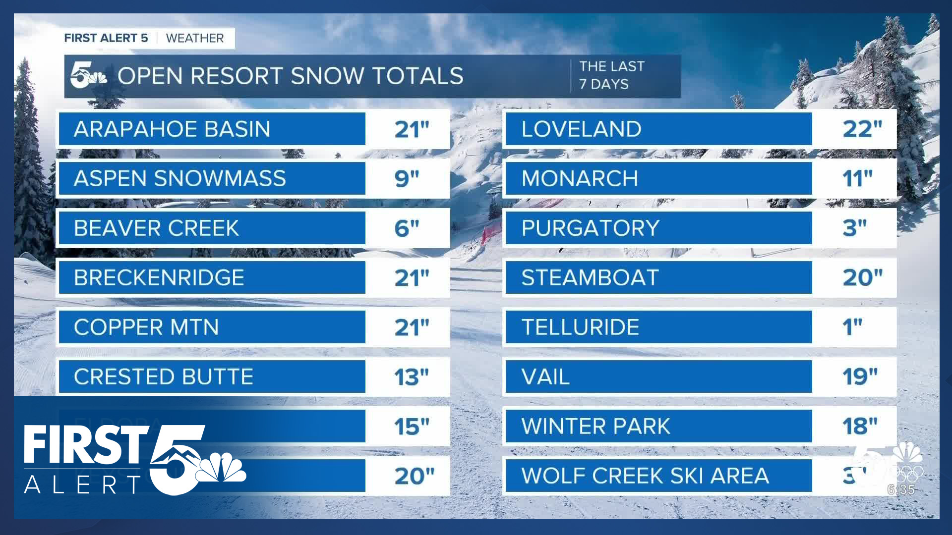 Snow totals for the resorts clustered along I-70 were in the 15-22" range in the last 7 days. This includes both weekend snow, a few inches at select resorts from an earlier weaker impulse of energy on Friday, and few widely scattered snow showers throughout this week (mostly providing 1" daily totals). Resorts in the San Juans didn't fare as well from last weekend's snow. Northwest flow doesn't favor those mountains, and they only saw a few inches.