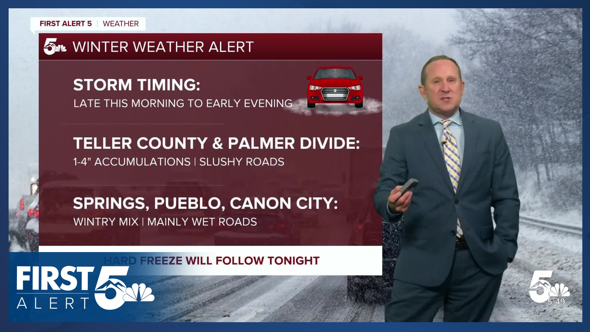 Tri-Lakes forecast: High: 30s/40s; Low: 10s. Morning commutes will be nice and mellow, but as snow moves in around the lunch hour (or sooner!), roads will become slick and slushy. The most impactful weather conditions will be from early this afternoon into your Friday evening. Snow totals from 1-4", with locally higher amounts possible, especially west of I-25.