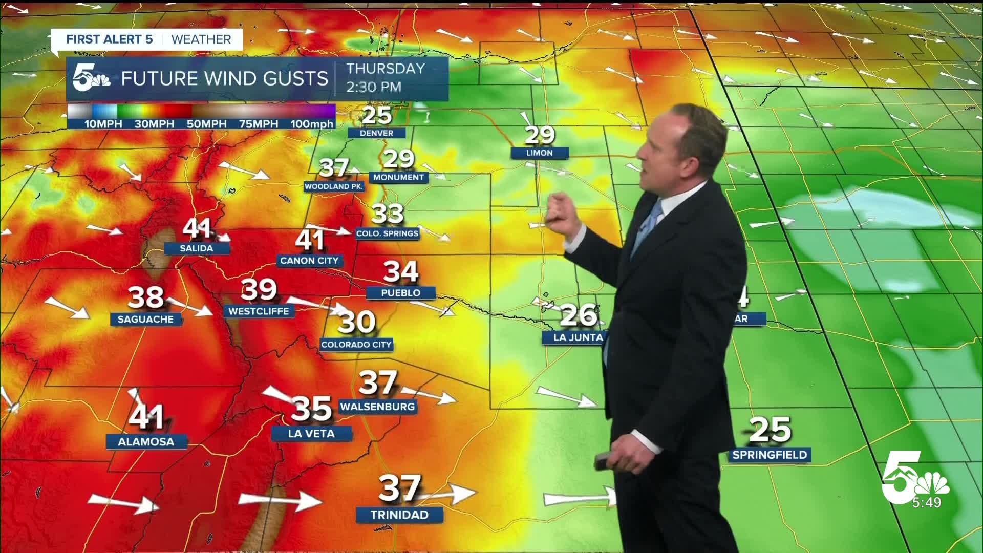 Red Flag Warnings will be in place from 11:00 AM - 9:00 PM, driven by a system tracking well to our north. That's why our wind direction is northwesterly today. You can expect sustained winds this afternoon of 15-30 mph. Highs today across Southern Colorado will be around 10-15 degrees cooler than yesterday.