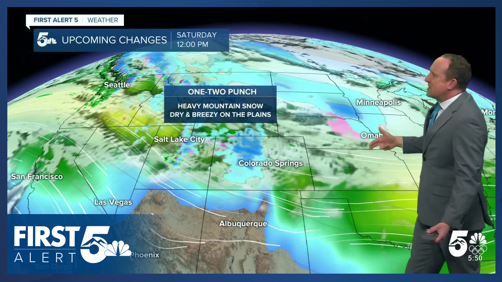 In Southern Colorado, we'll be on the dry, downslope side of Saturday's storm. Temperatures will warm into the mid to upper 40s along I-25 under partly to mostly cloudy skies. It will be breezy on Saturday, with NW wind gusts around 20-30 mph. If we do see any snow in the Pikes Peak Region, it would be towards Teller County, with only a 10% chance of snow on Saturday in El Paso County.