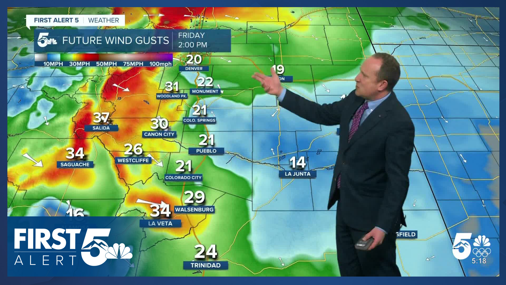 Skies will be mostly sunny today, with partly cloudy skies late this afternoon. Expect wind speeds of 10-20 mph from the west northwest, gusting 25-35 mph this afternoon. The strongest gusts will be west of I-25. Along I-25 will see gusts in the 20-25 mph range.