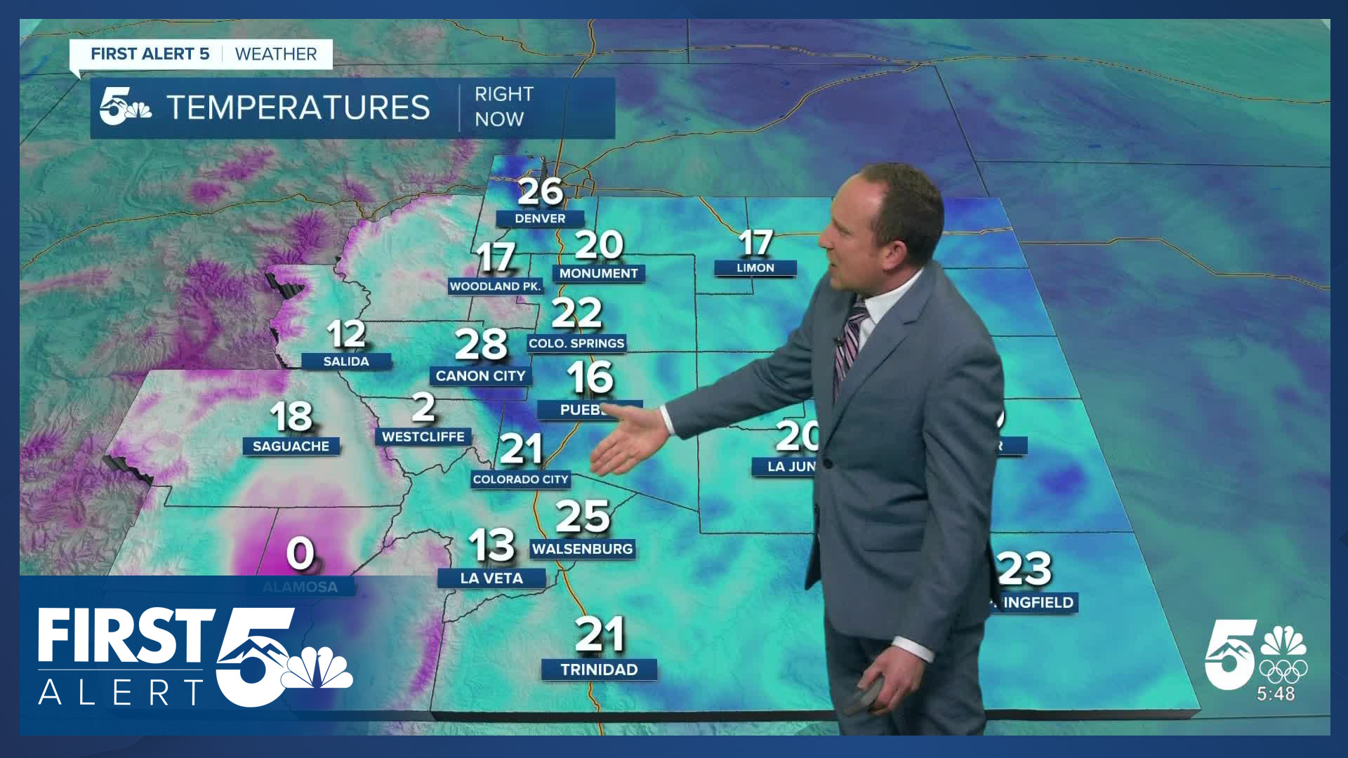 Your Friday will be a comfortable outdoor activity type of day in Southern Colorado. Although feels like temperatures early today are in the low teens along much of I-25, and negative in the mountain valleys - high pressure to the west of the Centennial State leads to another day with northwesterly flow. Winds today will be light, but that wind direction is downslope, which will help temperatures rise to the 40s and low 50s this afternoon. You'll see some passing mid-level clouds in the mid-morning period.