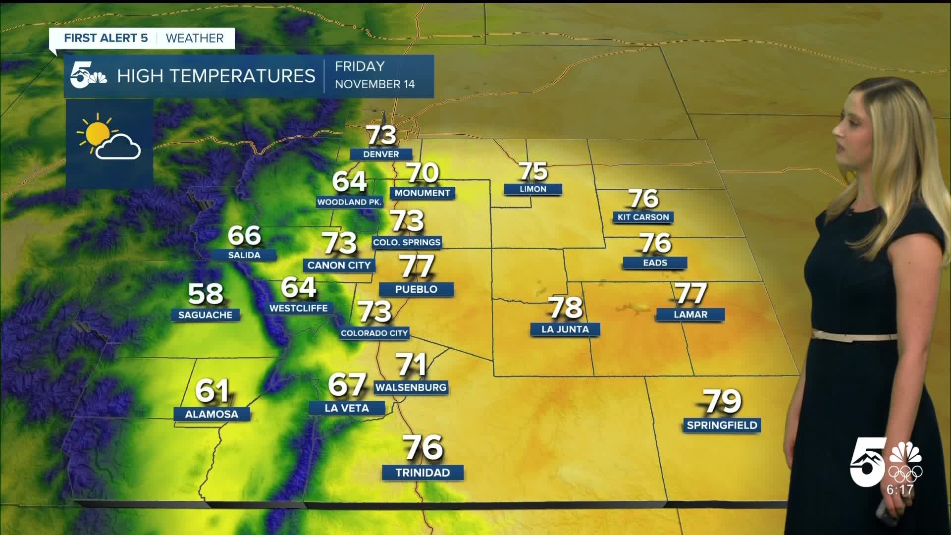 Friday will be another very warm day in Colorado Springs. The high temperature is almost 20 degrees above average. It will be partly cloudy. Wind will be out of the SSE at 5-10 mph, gusting to 15 mph.