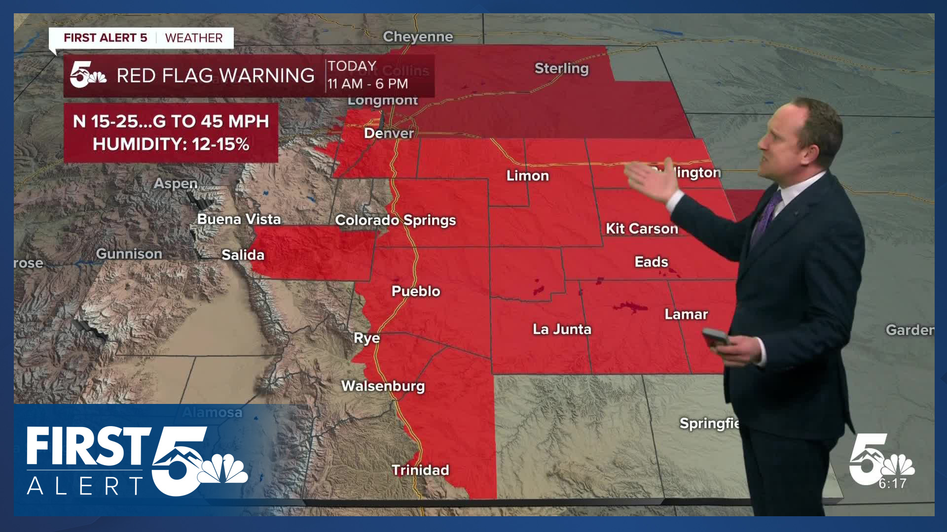 Behind a cold front this morning, northerly winds will increase across the rest of Colorado. This will lower humidity and lead to widespread high fire danger threats. A Red Flag Warning will remain in effect today from 11 am until 6 pm.