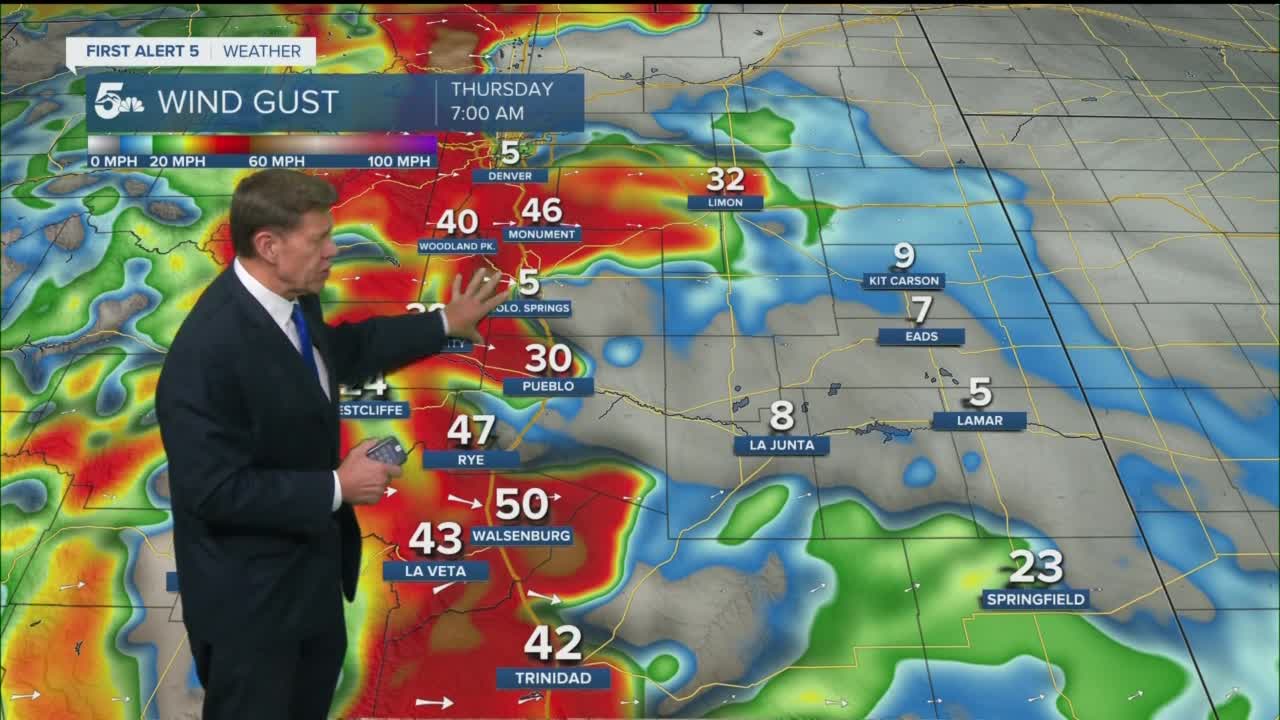 Colorado Springs forecast: Low: 23; High: 52; Mostly sunny and gusty on Thursday. Wind will be from the WNW sustained 15-20 mph gusting to 30 mph.
