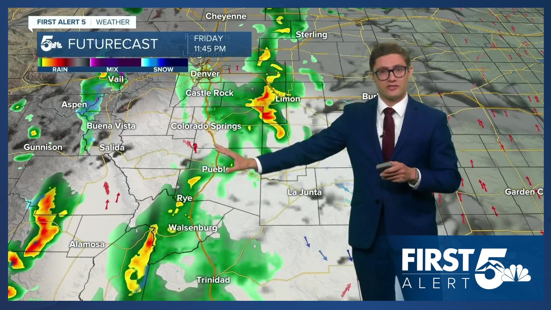 Residual moisture will fuel additional storm chances on Saturday afternoon. These storms will be less widespread but where they form, have the potential to be a bit stronger than storms today with a couple storms capable of 1" hail, and gusty wind. The storm potential will shift east as well. Showers and storms will remain widespread across most of the mountains - but will also make it out of the mountains and push out to the eastern plains in the later parts of the afternoon. Due to the cold front tonight, temperatures Saturday and Sunday will be cooler - in the 60s in the mountains, 70s to 80s along the Front Range and the plains.