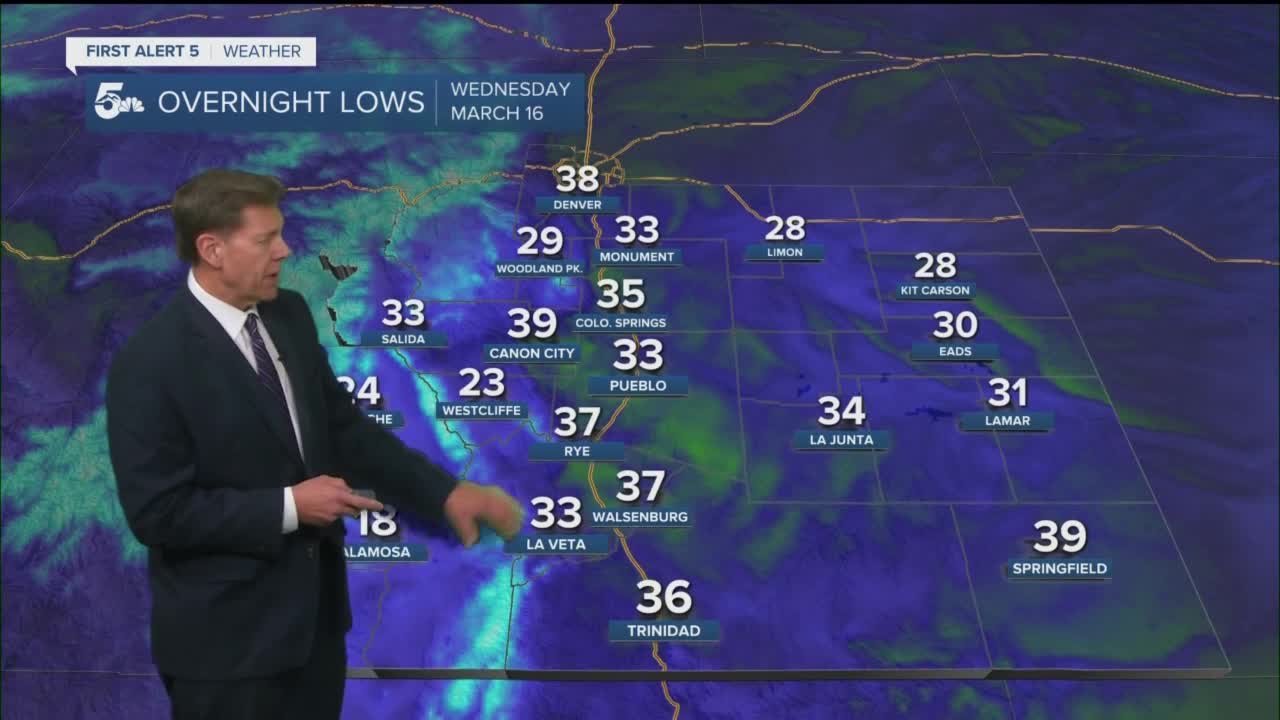 Colorado Springs forecast: Low: 35; High: 57; We'll be dry for most of the daylight hours on Wednesday before rain begins to push into the region around sunset. With snow levels up near 7,000 feet at the onset of the storm, rain won't likely changeover to snow until closer to 9-11 pm as colder air drops in from the north.