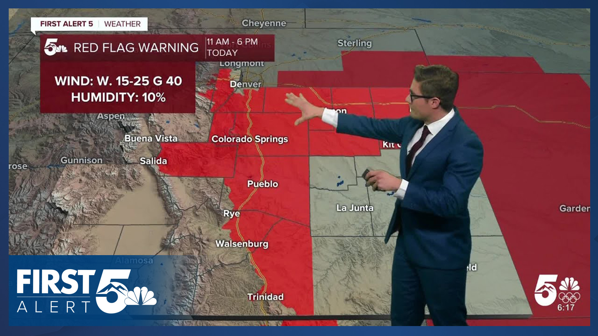 A very active week of weather begins today in southern Colorado as a fast jet stream roars overhead. Significant fire danger is the main concern. Red Flag Warnings cover the southern I-25 corridor today from 11:00 AM - 6:00 PM, plus Teller and Fremont counties.
