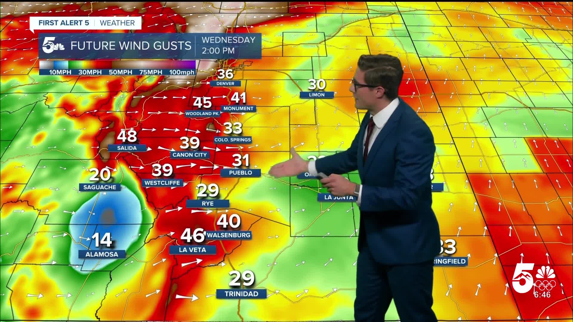 It will be mainly clear this evening in southern Colorado and the winds will remain fairly light - outside of the mountains. Lows will be fairly similar to what you saw this moring - upper 20s to low 30s. If you have lightweight outdoor objects that are not secure, you should secure them or bring them inside this evening if you don't want them to blow away. Also, be wary of parking your vehicle underneath tree branches if possible - this is more a suggestion for tomorrow's forecast. Wednesday brings a blend of High Wind Warnings, and Red Flag Warnings, to the area - with significant, to major impacts. See the extended forecast for more.