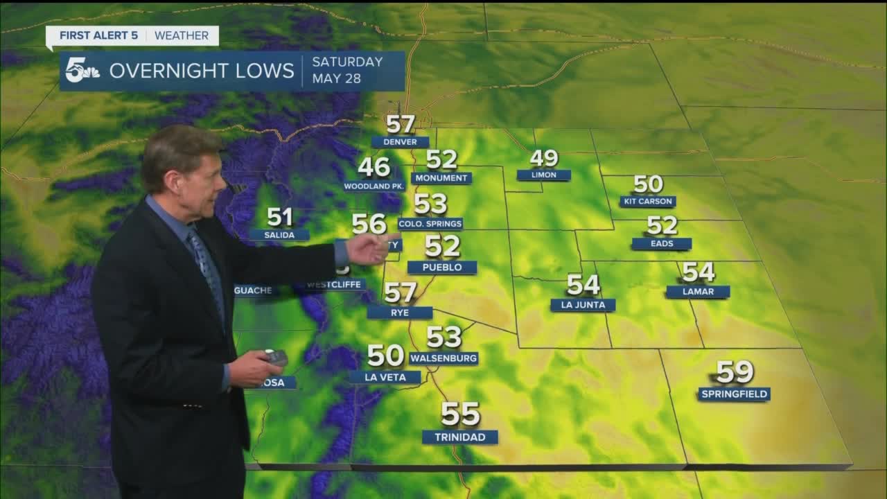 Mountains forecast: High: 70s; Low: 40s. Isolated thundershowers and virga will be possible in northern Fremont and Teller county over the mountains but most of our ranges will be dry, cool, and windy. We'll see high fire danger in the dry San Luis Valley through the afternoon.